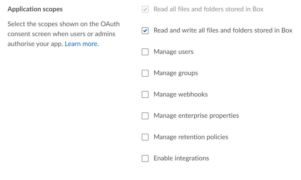 If you scroll down you will find the Application scopes, based on your application you can select or deselect the scopes, for this sample, let’s stick with the default scope which is Read and write files and folders stored in Box.