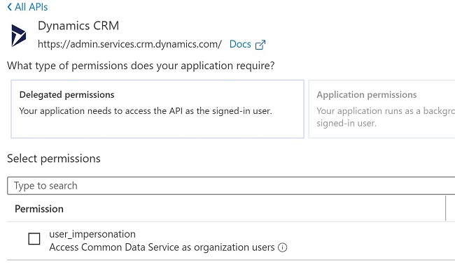 Go to App Registrations and find the app you created previously when you configure the Authentication/Authorization, go to API permissions and click on Add a permission. from the list, select the Dynamics CRM, for permission type select Delegated permissions and select user_impersonation as permission.