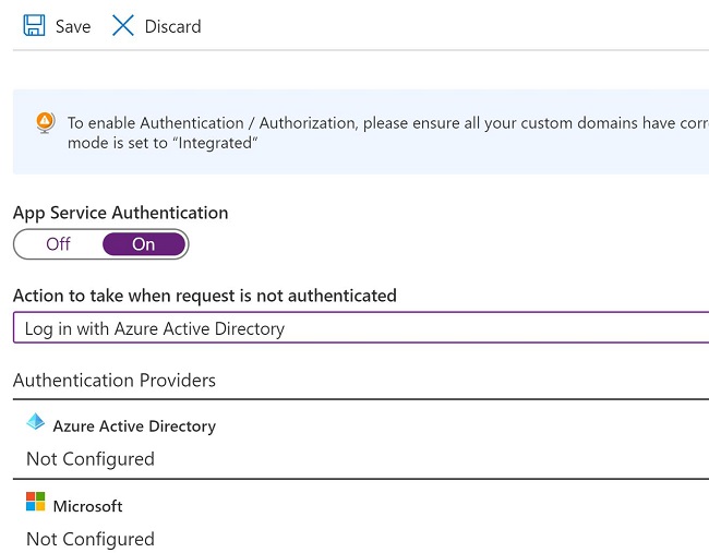 Under Authentication Providers select Azure Active Directory, select Express and create a new App Registration.