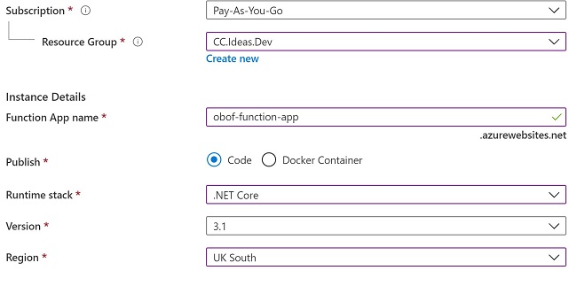 Let’s start with the Azure Function, go to Azure portal and create a new Function App with following settings.