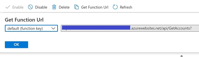 public static class GetAccounts { [FunctionName("GetAccounts")] public static async Task<IActionResult> Run( [HttpTrigger(AuthorizationLevel.Anonymous, "get", "post", Route = null)] HttpRequest req, ILogger log) { log.LogInformation("C# HTTP trigger function processed a request."); try { var jwtToken = req.Headers.FirstOrDefault(x => x.Key == "Authorization").Value.FirstOrDefault(); var resource = req.Query["resource"]; var token = GetDynamicsCrmAccessToken(jwtToken.Replace("Bearer ",""),resource); using (HttpClient httpClient = new HttpClient()) { httpClient.BaseAddress = new Uri(resource); httpClient.Timeout = new TimeSpan(0, 2, 0); httpClient.DefaultRequestHeaders.Add("OData-MaxVersion", "4.0"); httpClient.DefaultRequestHeaders.Add("OData-Version", "4.0"); httpClient.DefaultRequestHeaders.Accept.Add( new MediaTypeWithQualityHeaderValue("application/json")); httpClient.DefaultRequestHeaders.Authorization = new AuthenticationHeaderValue("Bearer", token); HttpResponseMessage retrieveResponse = await httpClient.GetAsync("/api/data/v9.1/accounts?$select=accountid,name,emailaddress1&$top=5"); if (retrieveResponse.IsSuccessStatusCode) { var results = await retrieveResponse.Content.ReadAsStringAsync(); var jsonObject = JsonConvert.DeserializeObject(results); return new OkObjectResult(jsonObject); } else return new BadRequestErrorMessageResult(""); } } catch(Exception ex) { return new BadRequestErrorMessageResult(ex.Message); } } private static string GetDynamicsCrmAccessToken(string jwtToken, string crmUri) { var crmResourceUri = $"{crmUri}/.default"; var clientId = Environment.GetEnvironmentVariable("CLIENTID"); var clientSecret = Environment.GetEnvironmentVariable("CLIENTSECRET"); var tenantId = Environment.GetEnvironmentVariable("TENANTID"); List<string> scopes = new List<string>(); scopes.Add(crmResourceUri); var app = ConfidentialClientApplicationBuilder.Create(clientId) .WithClientSecret(clientSecret) .WithTenantId(tenantId) .Build(); var userAssertion = new UserAssertion(jwtToken); var result = app.AcquireTokenOnBehalfOf(scopes, userAssertion).ExecuteAsync().GetAwaiter().GetResult(); return result.AccessToken; } }