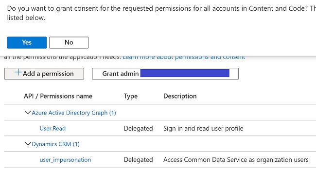 Grant admin consent fo the requested permissions by clicking on Grant admin consent button.