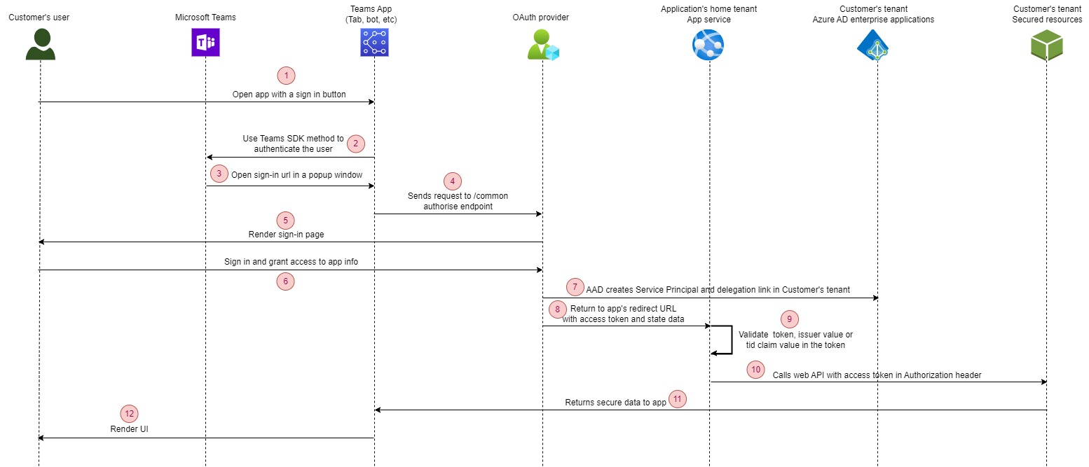 - The tab constructs the URL for its auth start page, then use Microsoft Teams SDK methods to pop-up a window.