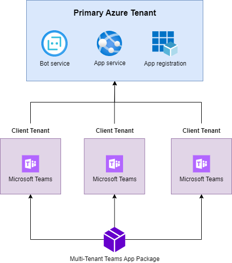 We will host our backend services, including the bot service and app service, along with app registration within a primary Azure tenant. Subsequently, we can distribute the Microsoft Teams package across multiple tenants.