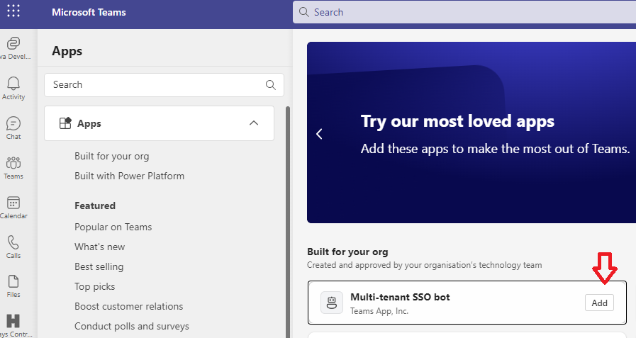 Open Microsoft Teams, select Apps from the left bar and install the bot: