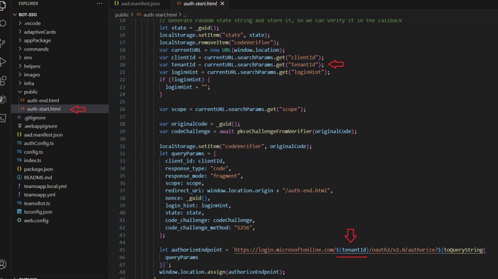 What we should alter next is the endpoint. Open the auth-start.html page and you can see that it utilizes a single tenant endpoint for user authorization.