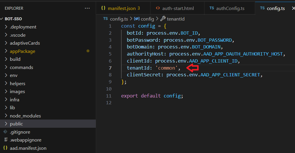 Open config.ts file and change the tenantId property to “common”.