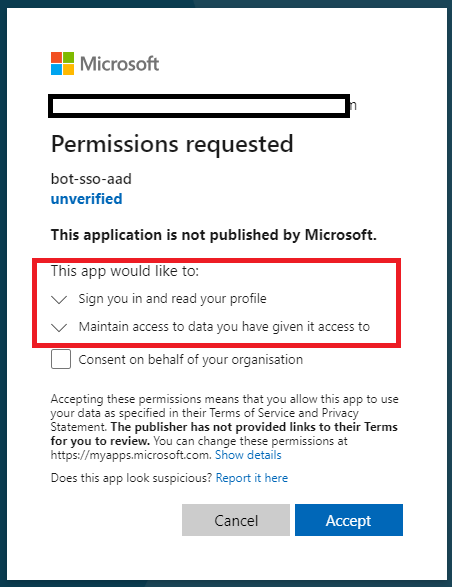 In a popup you will be asked to consent to the permissions requested by the application: