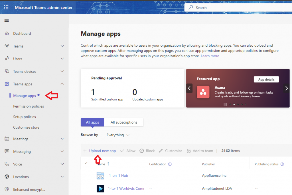 Navigate to Teams admin centre and select Manage Apps, select “Upload new app” and choose the package to upload the app.