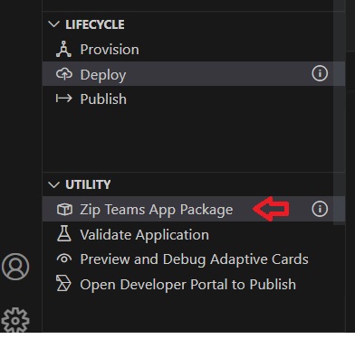 From Visual Studio Code, select Teams Toolkit from the left bar, and select “Zip Teams App Package“: