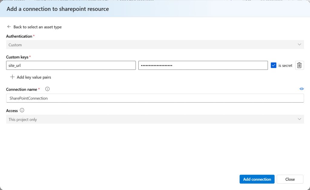 Troubleshooting Tip: If connection fails, verify that your Azure AI service has the necessary permissions to access SharePoint through your organization’s Microsoft 365 tenant.