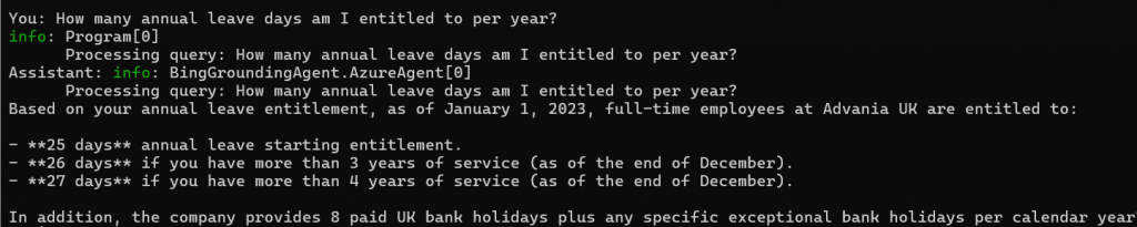 The Agent Wrapper provides additional functionality around the core Azure AI agent. It handles agent initialization, clean-up, and resource management to ensure optimal performance and prevent memory leaks. I’ve added another method to this class:
