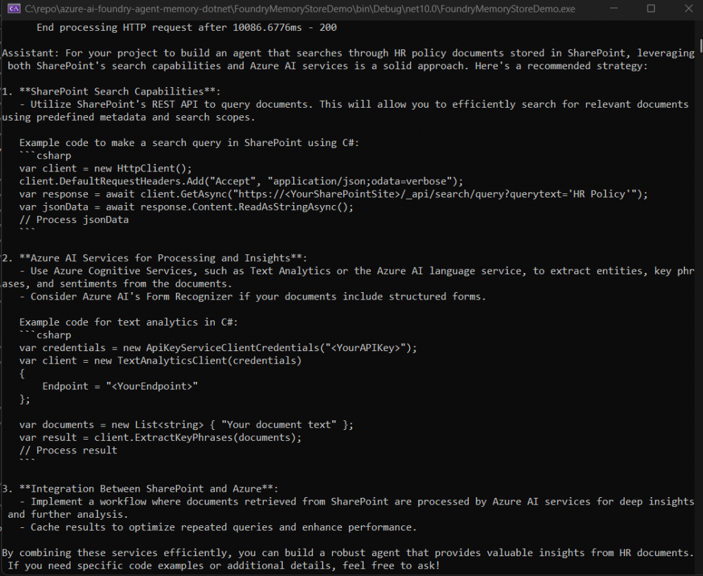 Assistant: For your project to build an agent that searches through HR policy documents stored in SharePoint, leveraging both SharePoint's search capabilities and Azure AI services is a solid approach. Here's a recommended strategyThe agent knew the user works at Contoso, prefers C#, and is building a SharePoint HR document agent — all from the previous session. The user didn’t repeat any of that context. That’s the value of long-term memory.