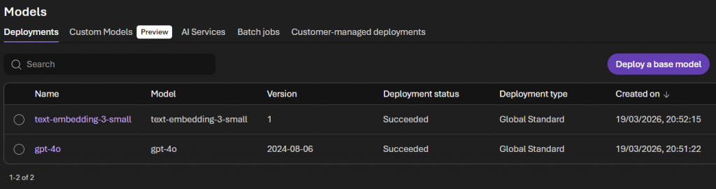 Navigate to your Foundry project’s “Models + Endpoints” section and deploy both if you haven’t already. Note down the deployment names.